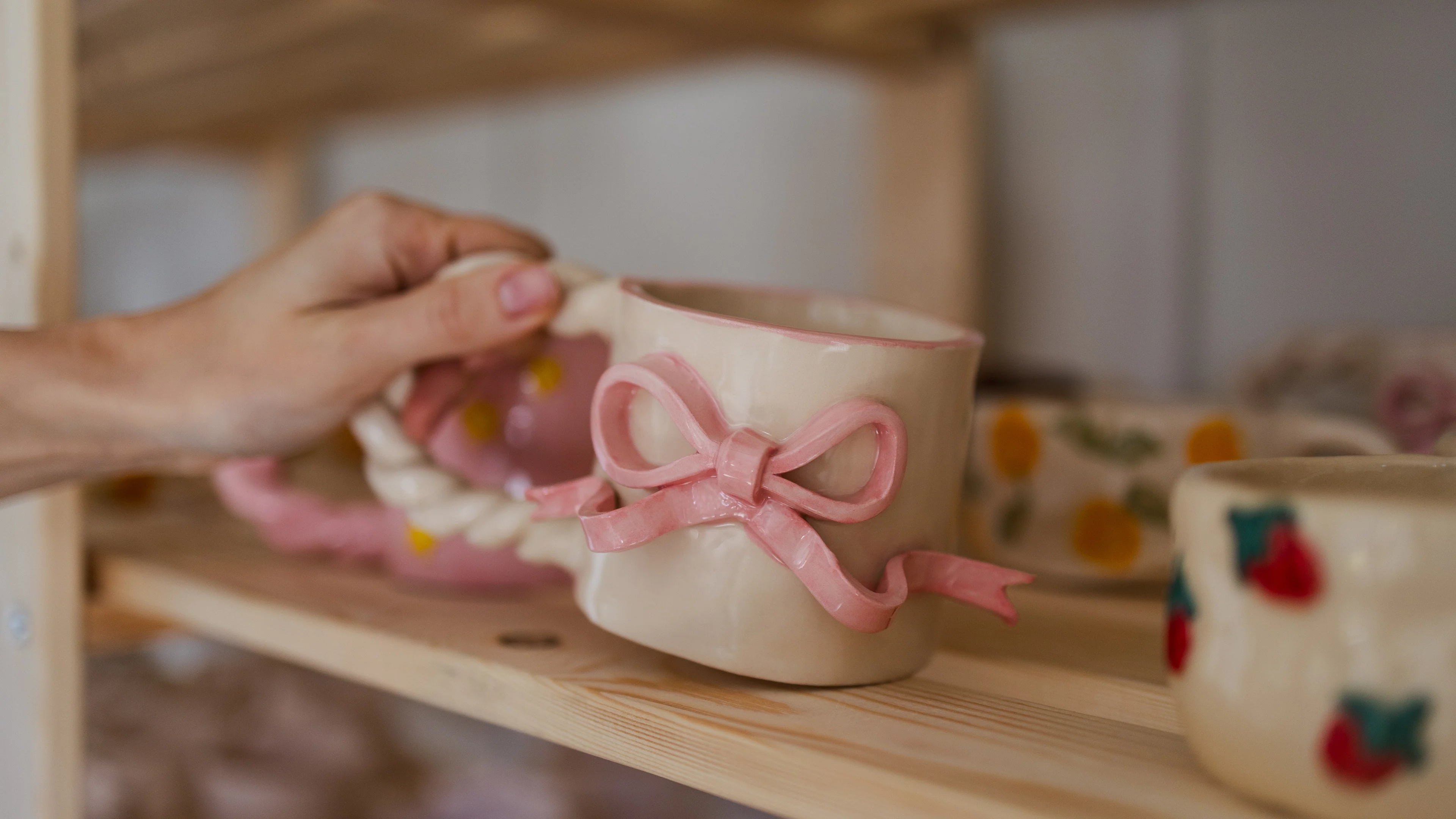 Handmade Ceramic Coffee Mug with Pink Bow | Cute Aesthetic Tea Cup | Artisan Ceramic Drinkware